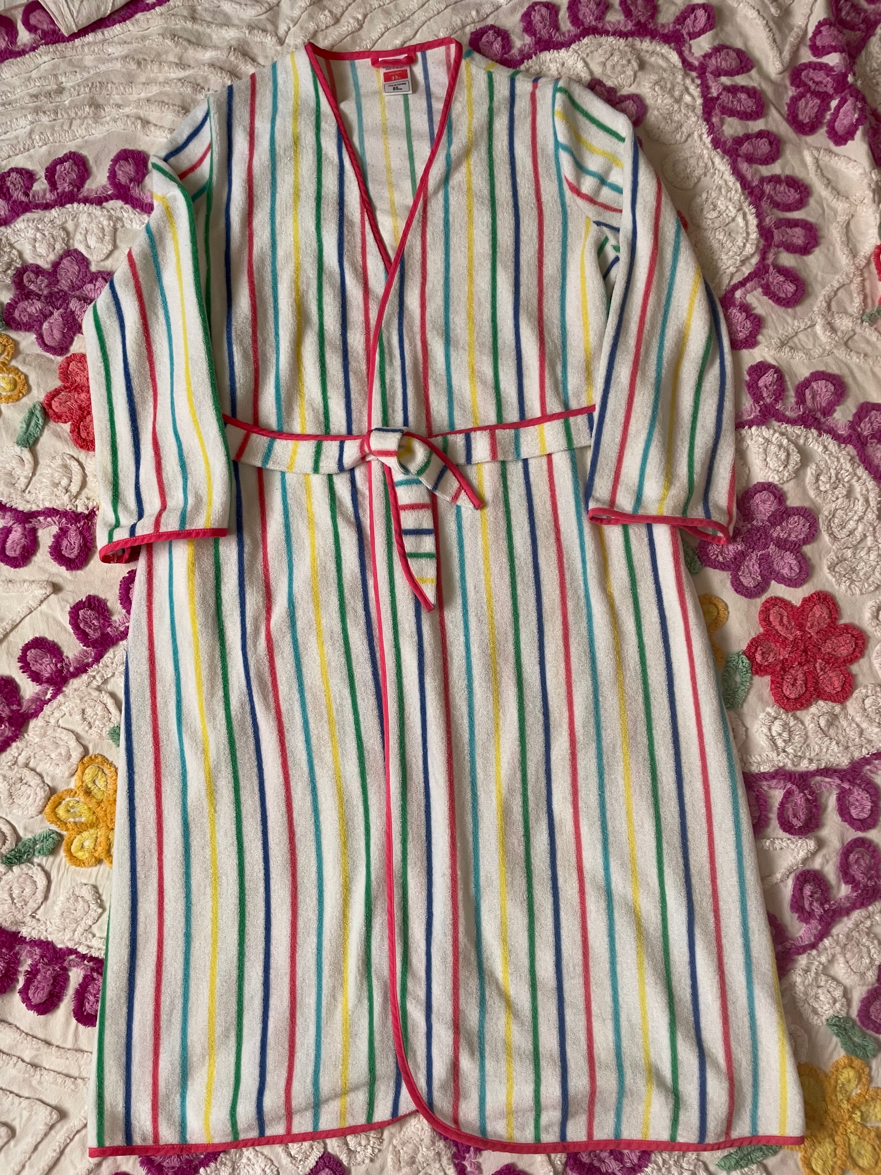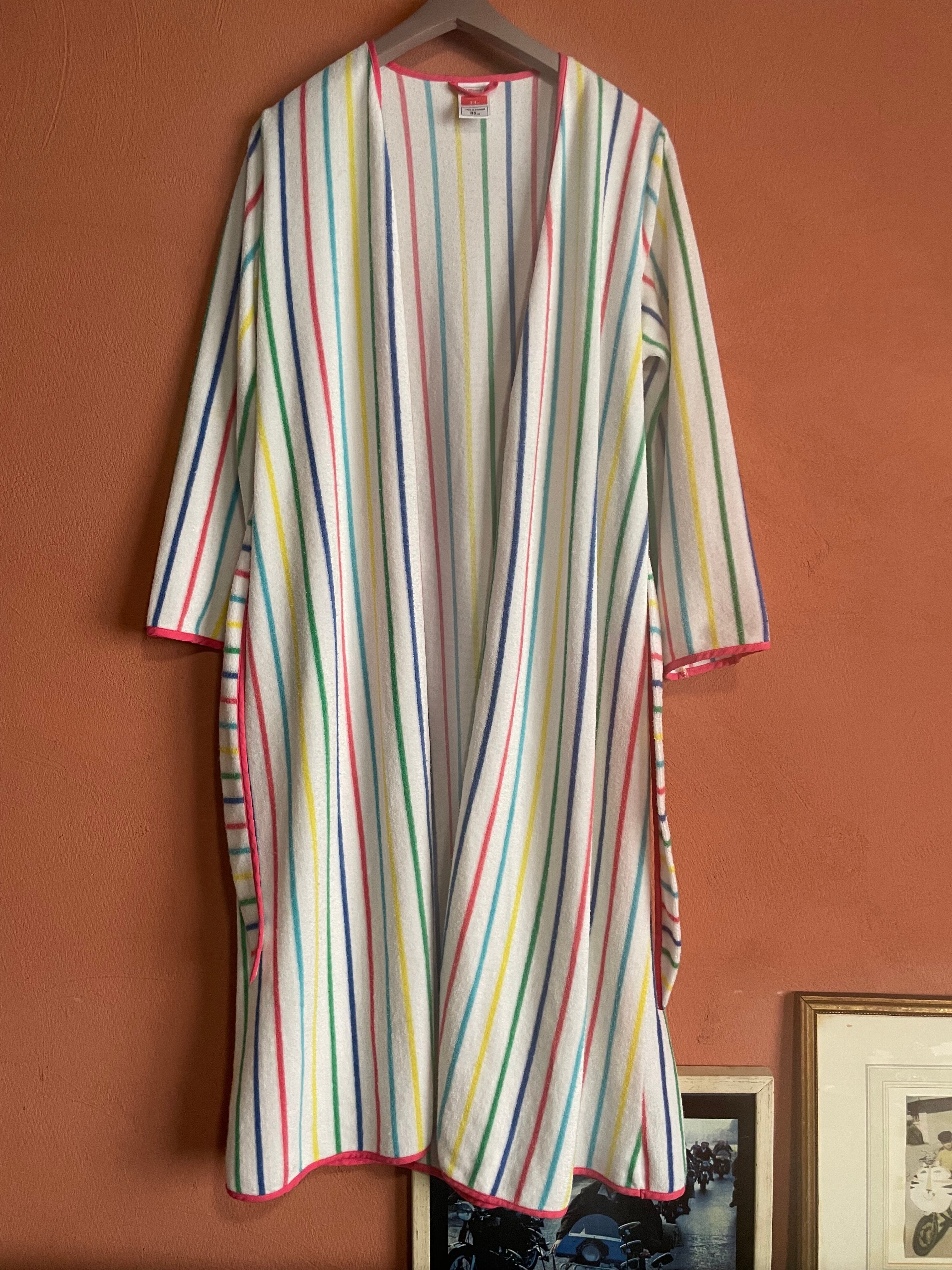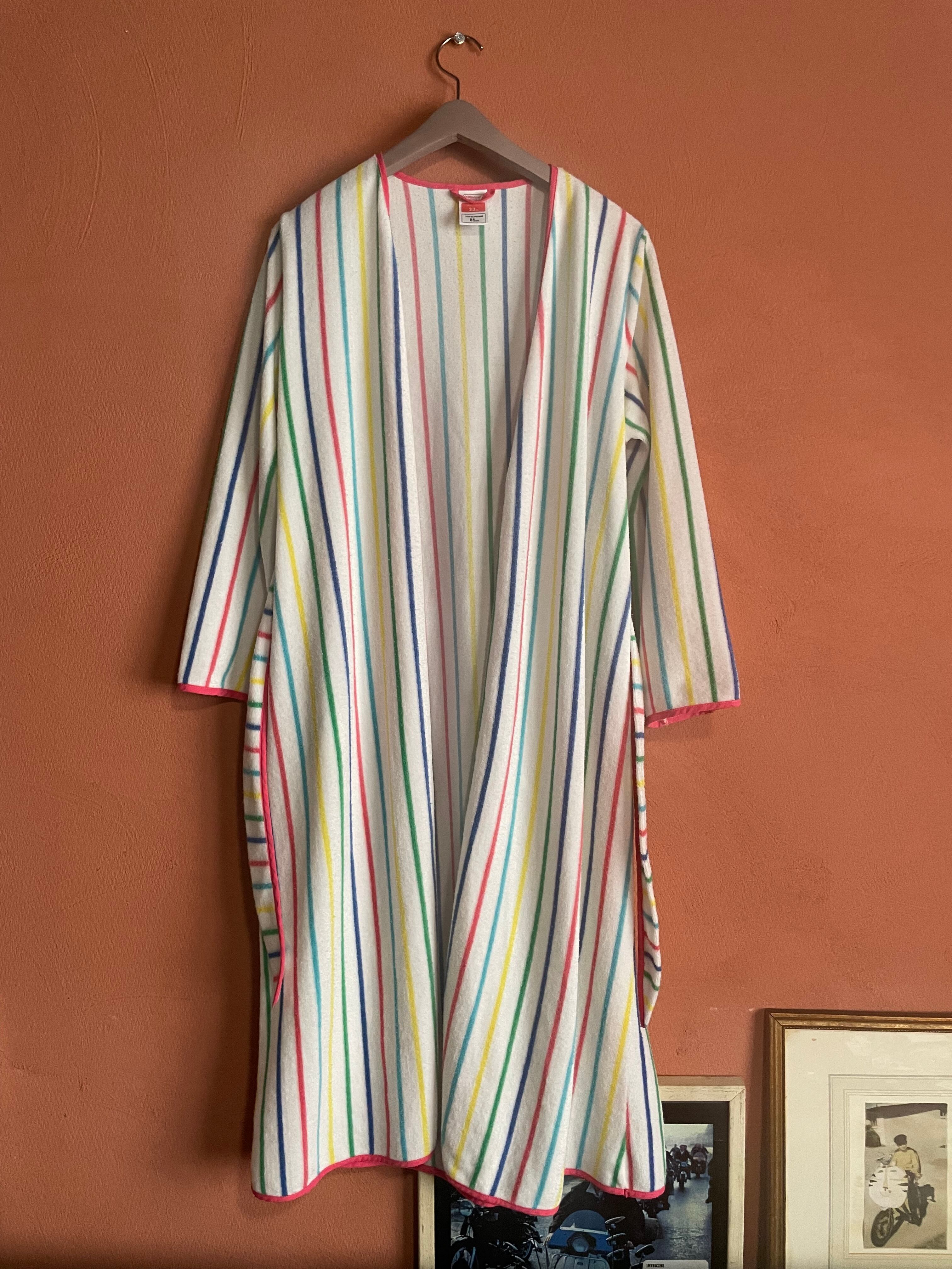 カラフルな色合いとパイピングがポイントで羽織ってよし、ウエストの紐を巻いて着ても可愛いガウンです