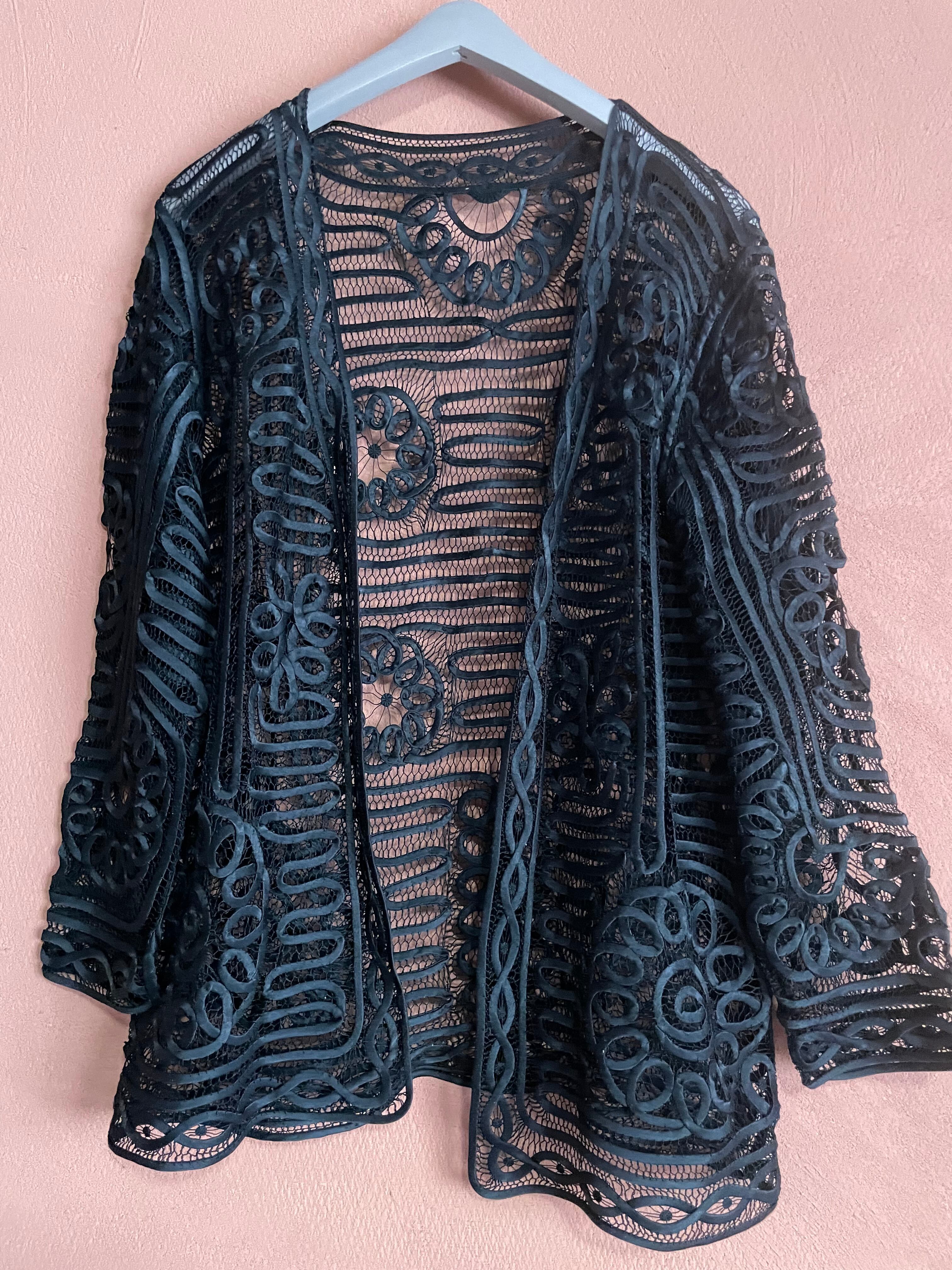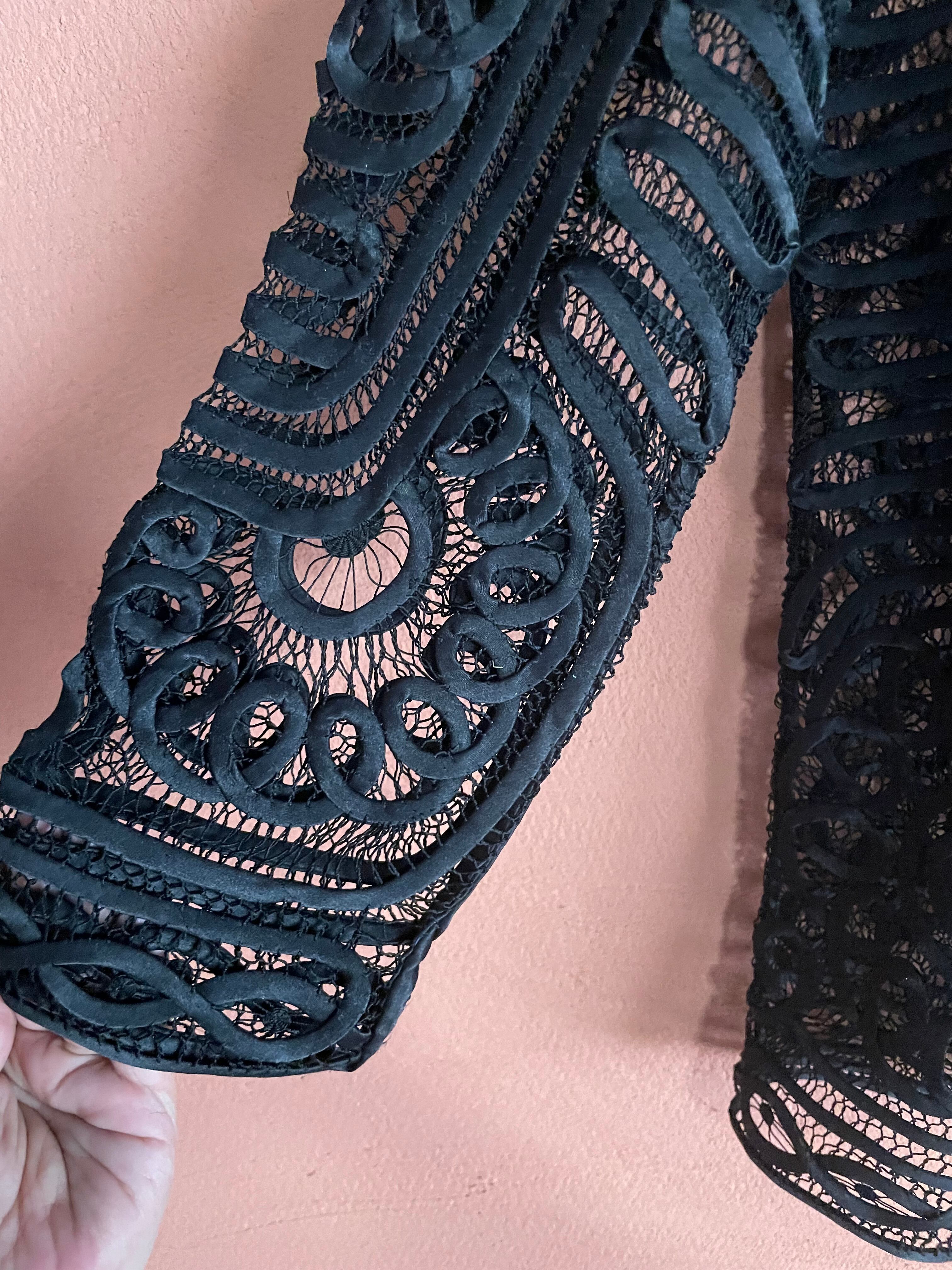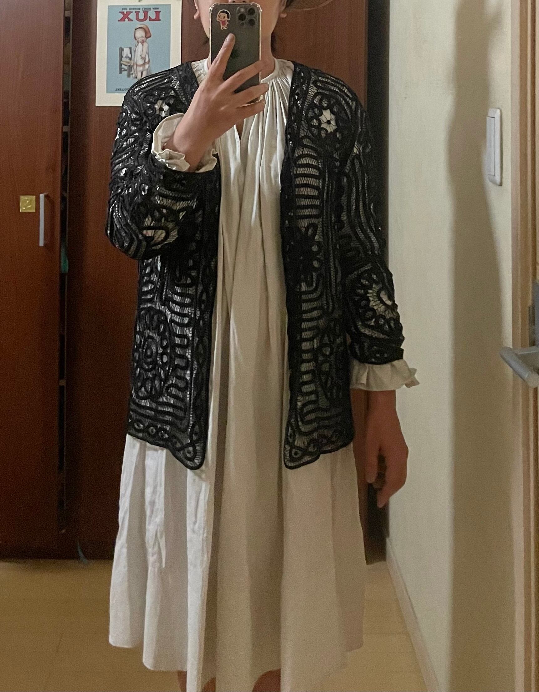 なんとも芸術的で繊細なレース編みが見事な一着です