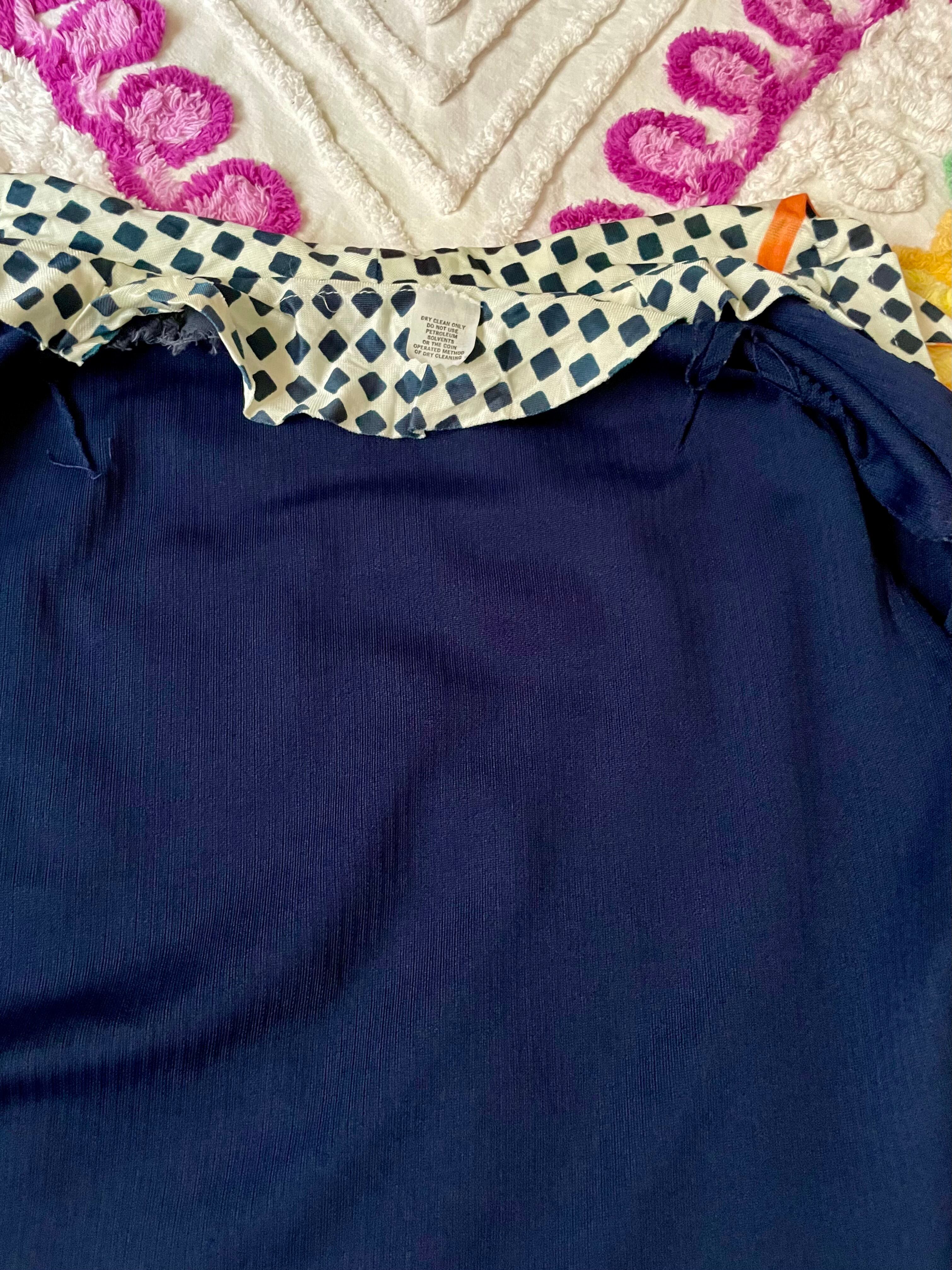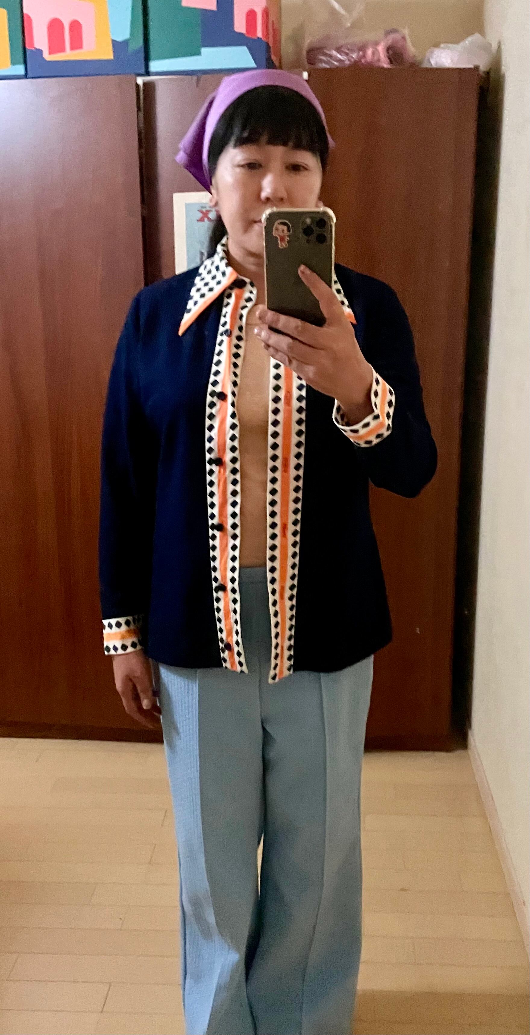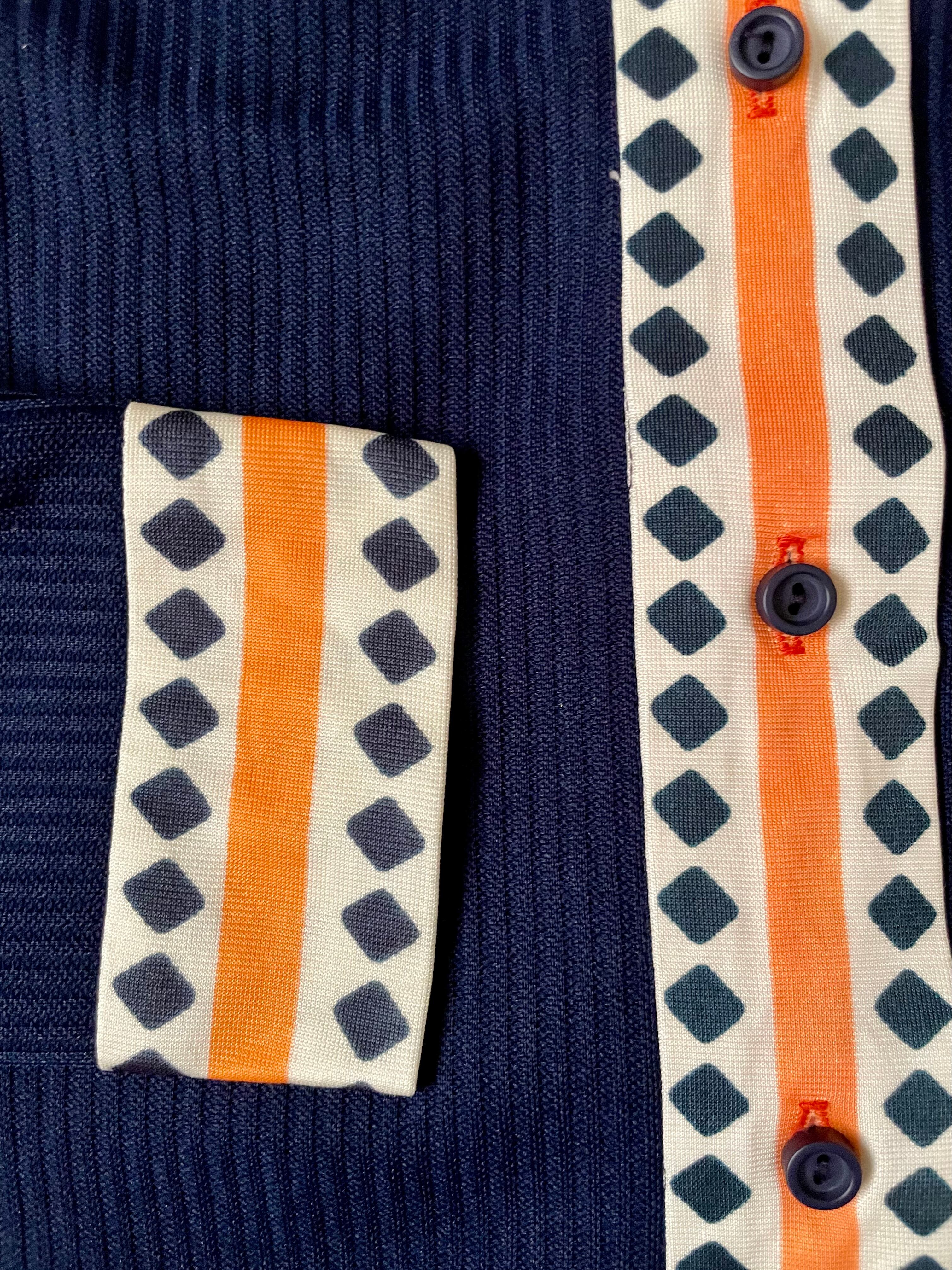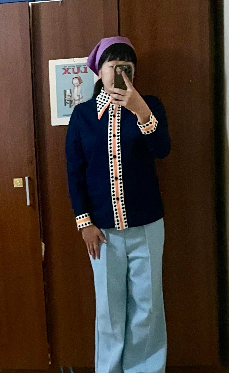 色みはシックですが襟とフロントと袖先の柄が効いているとても素敵な1枚です