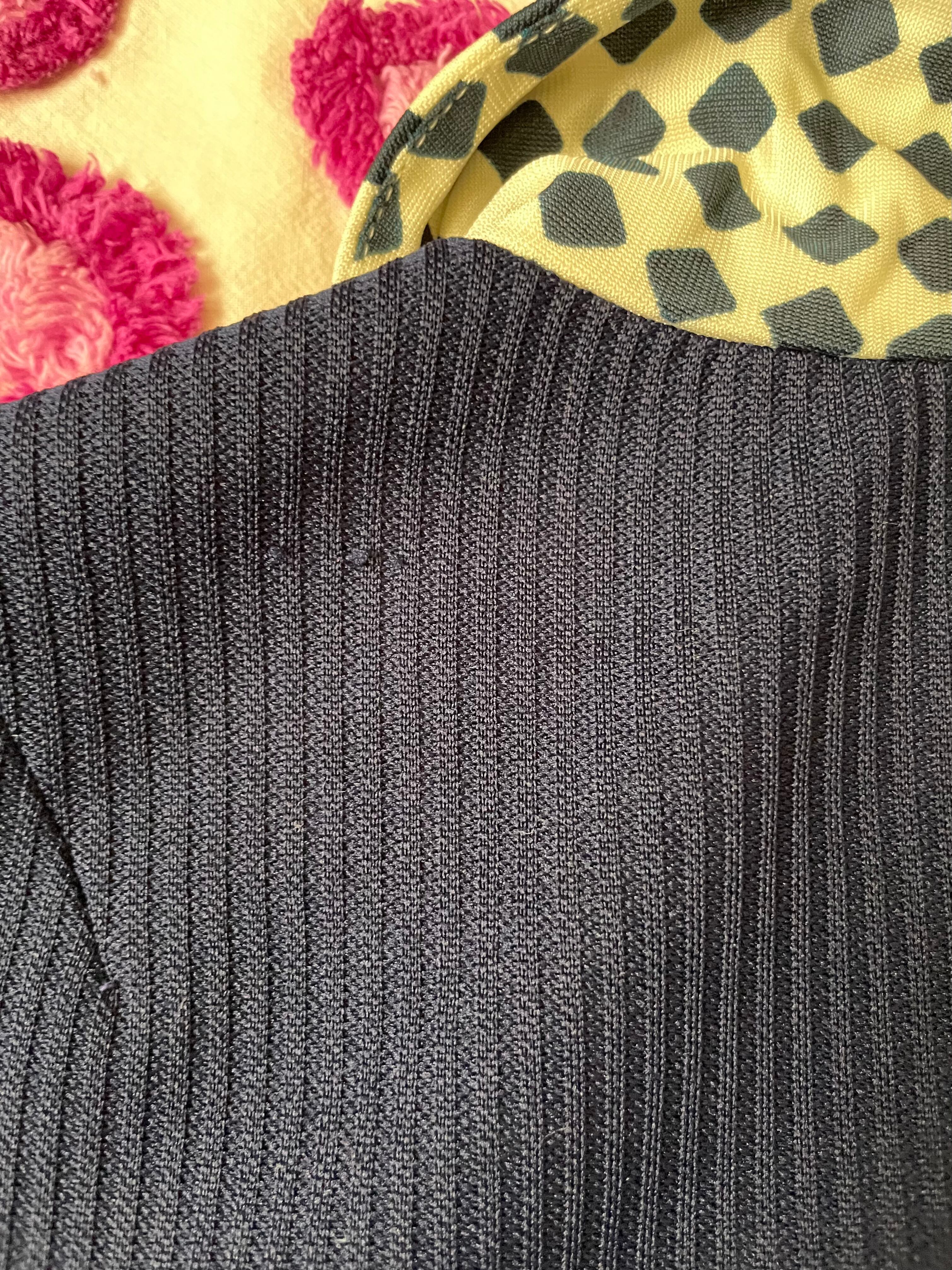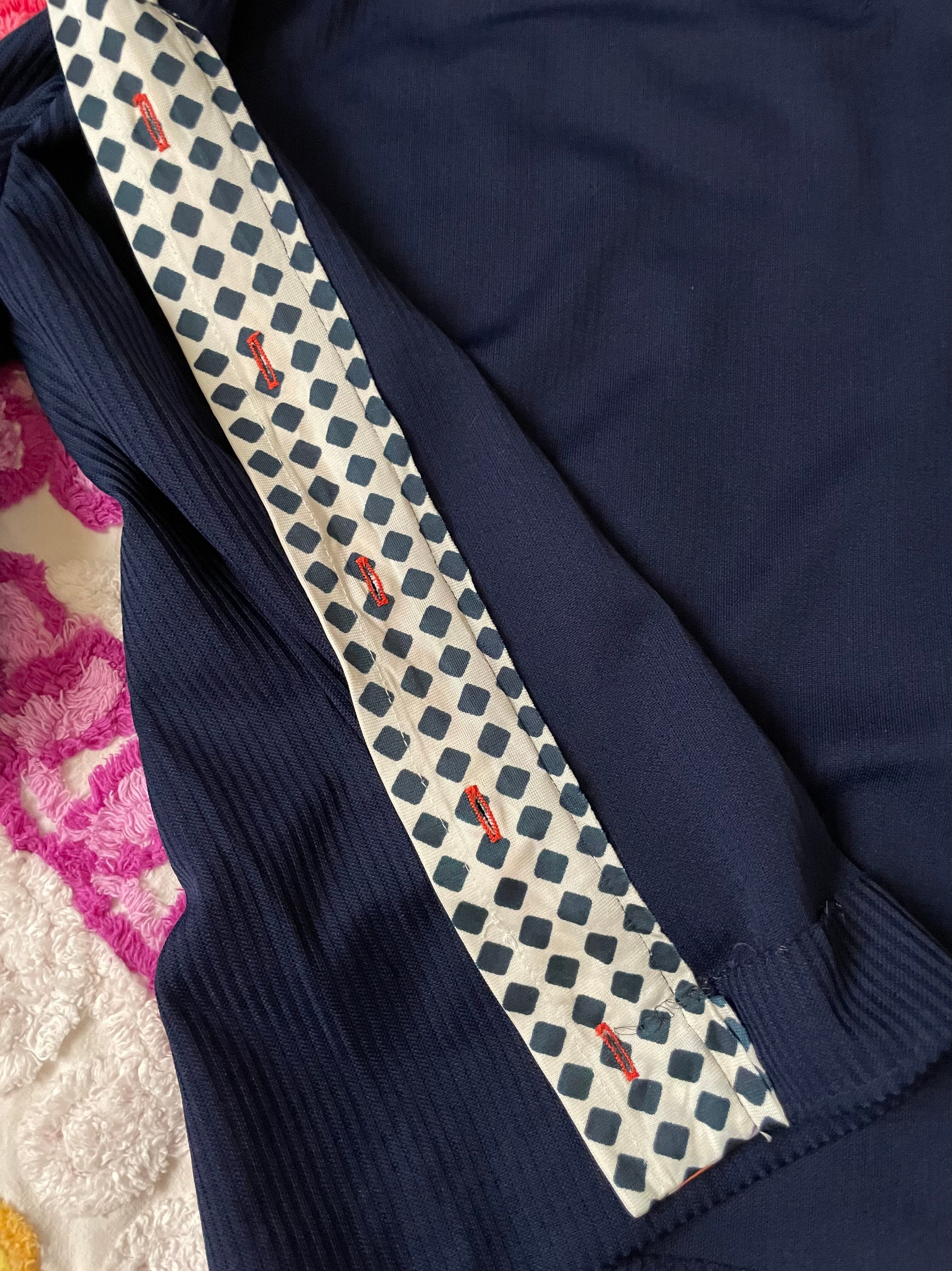 素材表記がないのですが、襟とフロント、袖先はナイロンで本体はポリエステルではないかと思います